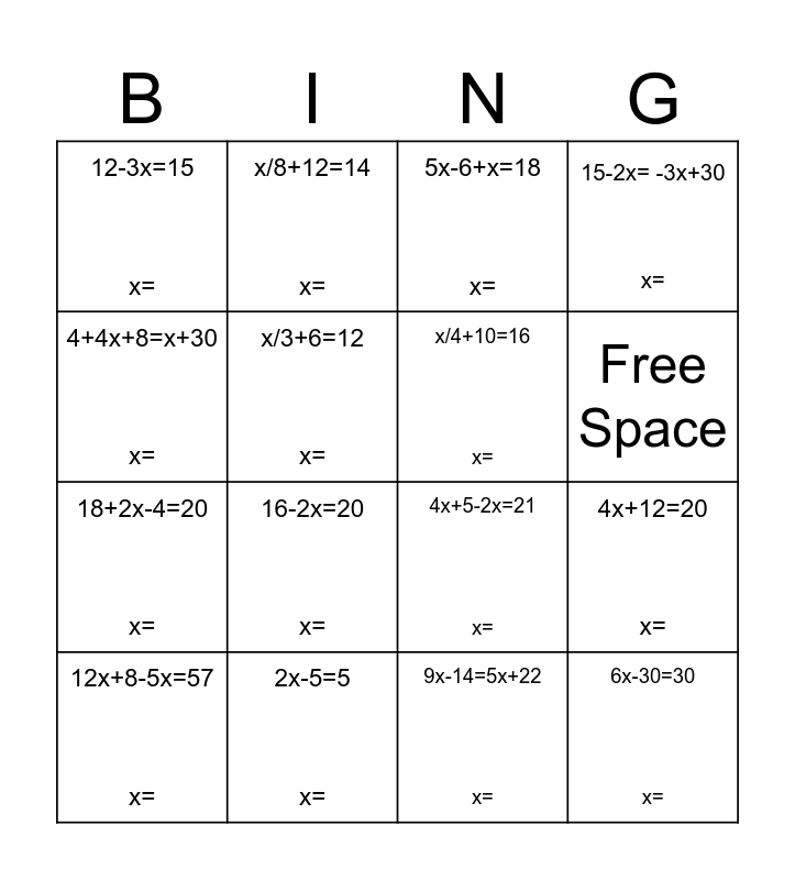 This bingo card has 16 words: 2x-5=5 x=, 4x+12=20 x=, 5x-6+x=18 x=, 12-3x=15 x=, 18+2x-4=20 x=, x/8+12=14 x=, 4x+5-2x=21 x=, 9x-14=5x+22 x=, 4+4x+8=x+30 x=, x/3+6=12 x=, 12x+8-5x=57 x=, 15-2x= -3x+30 x=, 16-2x=20 x=, Free Space, x/4+10=16 x= and 6x-30=30 x=.