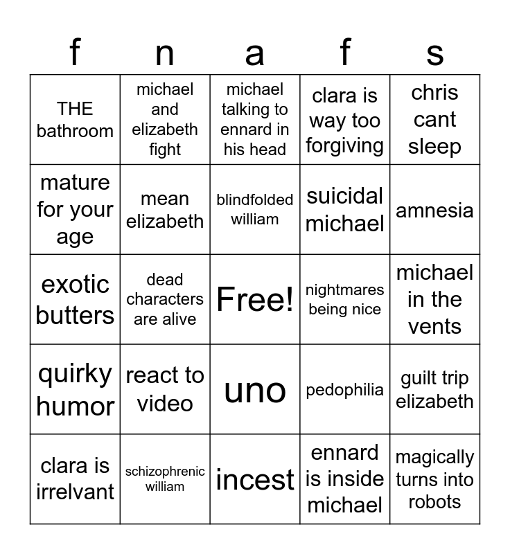 This bingo card has a free space and 31 words: incest, glitchtrap is the killer, dead characters are alive, shipping robots, THE bathroom, michael talking to ennard in his head, mean elizabeth, pedophilia, nightmares being nice, ennard is inside michael, michael in the vents, magically turns into robots, femboy william, chris is a "cinnamon roll", amnesia, forgave a murderer, guilt trip elizabeth, react to video, quirky humor, uno, chris cant sleep, michael cant eat, clara is irrelvant, michael and elizabeth fight, suicidal michael, mature for your age, clara is way too forgiving, exotic butters, schizophrenic william, blindfolded william and clara has no personality.