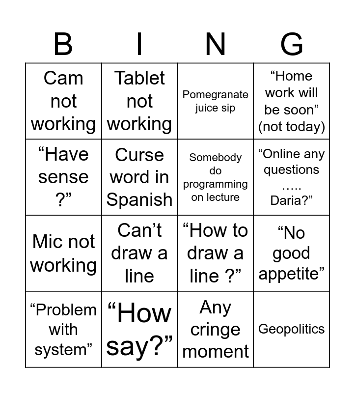 This bingo card has 16 words: “How say?”, “No good appetite”, Pomegranate juice sip, Cam not working, Mic not working, Tablet not working, “How to draw a line ?”, Any cringe moment, “Have sense ?”, Curse word in Spanish, “Problem with system”, “Home work will be soon” (not today), Can’t draw a line, “Online any questions ….. Daria?”, Somebody do programming on lecture and Geopolitics.