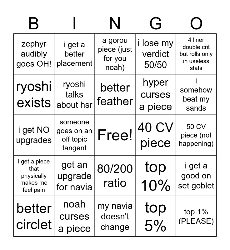 This bingo card has a free space and 24 words: get an upgrade for navia, noah curses a piece, better feather, better circlet, 4 liner double crit but rolls only in useless stats, zephyr audibly goes OH!, ryoshi exists, i get a better placement, 40 CV piece, 80/200 ratio, hyper curses a piece, i get NO upgrades, top 10%, i get a good on set goblet, ryoshi talks about hsr, top 5%, 50 CV piece (not happening), a gorou piece (just for you noah), i somehow beat my sands, someone goes on an off topic tangent, top 1% (PLEASE), i get a piece that physically makes me feel pain, i lose my verdict 50/50 and my navia doesn't change.
