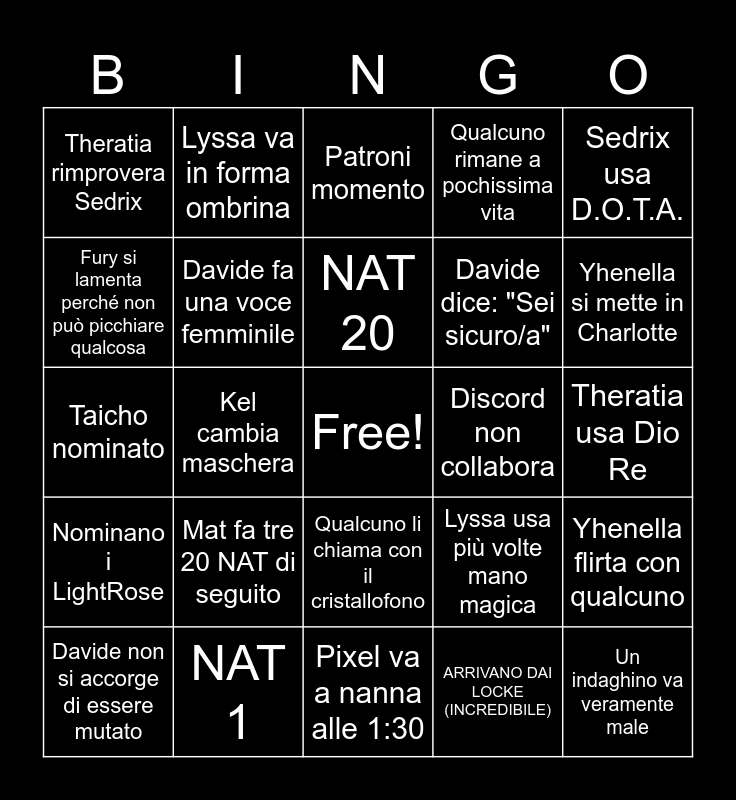 This bingo card has a free space and 24 words: Mat fa tre 20 NAT di seguito, NAT 1, NAT 20, Davide non si accorge di essere mutato, Sedrix usa D.O.T.A., Theratia rimprovera Sedrix, Fury si lamenta perché non può picchiare qualcosa, Lyssa va in forma ombrina, Discord non collabora, Qualcuno li chiama con il cristallofono, Davide dice: "Sei sicuro/a", Taicho nominato, Lyssa usa più volte mano magica, Yhenella flirta con qualcuno, Davide fa una voce femminile, ARRIVANO DAI LOCKE (INCREDIBILE), Theratia usa Dio Re, Patroni momento, Yhenella si mette in Charlotte, Kel cambia maschera, Un indaghino va veramente male, Nominano i LightRose, Qualcuno rimane a pochissima vita and Pixel va a nanna alle 1:30.