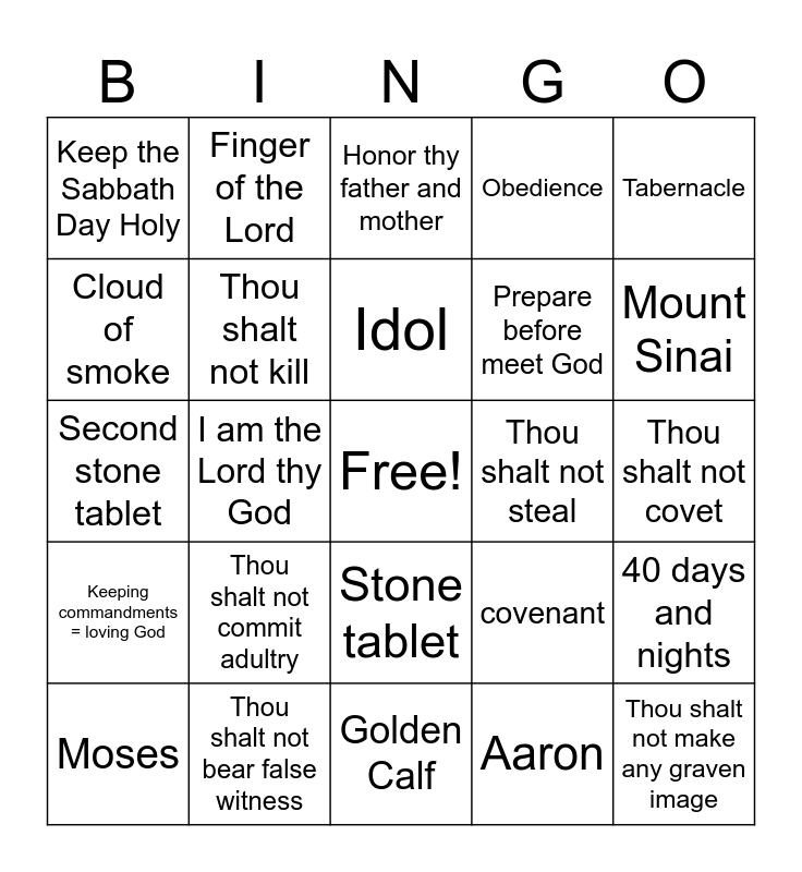 This bingo card has a free space and 29 words: Moses, 10 commandments, I am the Lord thy God, Do not take God's name in vain, Keep the Sabbath Day Holy, Honor thy father and mother, Thou shalt not kill, Thou shalt not commit adultry, Thou shalt not steal, Thou shalt not bear false witness, Thou shalt not covet, Thou shalt not make any graven image, Golden Calf, Aaron, Mount Sinai, Ye shalt be a peculiar treasure, Stone tablet, Keeping commandments = loving God, Tabernacle, Second stone tablet, covenant, Ark of the Testimony, Prepare before meet God, Cloud of smoke, Obedience, Finger of the Lord, 40 days and nights, Idol and Repent.