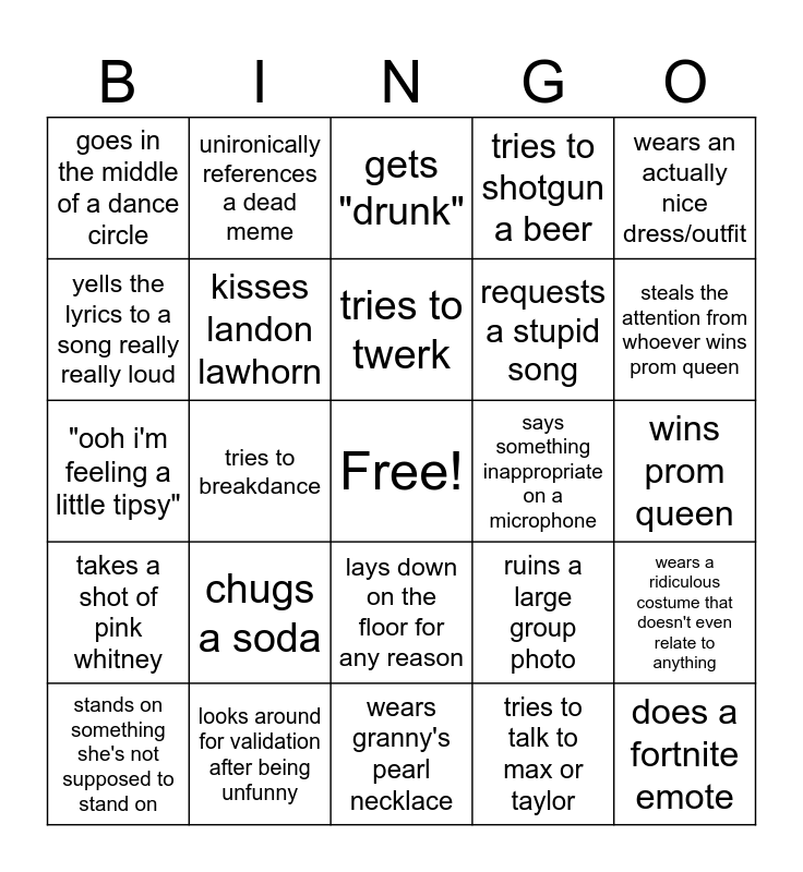 This bingo card has a free space and 24 words: stands on something she's not supposed to stand on, chugs a soda, tries to twerk, tries to talk to max or taylor, wears an actually nice dress/outfit, goes in the middle of a dance circle, unironically references a dead meme, gets "drunk", says something inappropriate on a microphone, wins prom queen, "ooh i'm feeling a little tipsy", kisses landon lawhorn, ruins a large group photo, wears a ridiculous costume that doesn't even relate to anything, yells the lyrics to a song really really loud, looks around for validation after being unfunny, wears granny's pearl necklace, tries to shotgun a beer, steals the attention from whoever wins prom queen, takes a shot of pink whitney, tries to breakdance, lays down on the floor for any reason, requests a stupid song and does a fortnite emote.