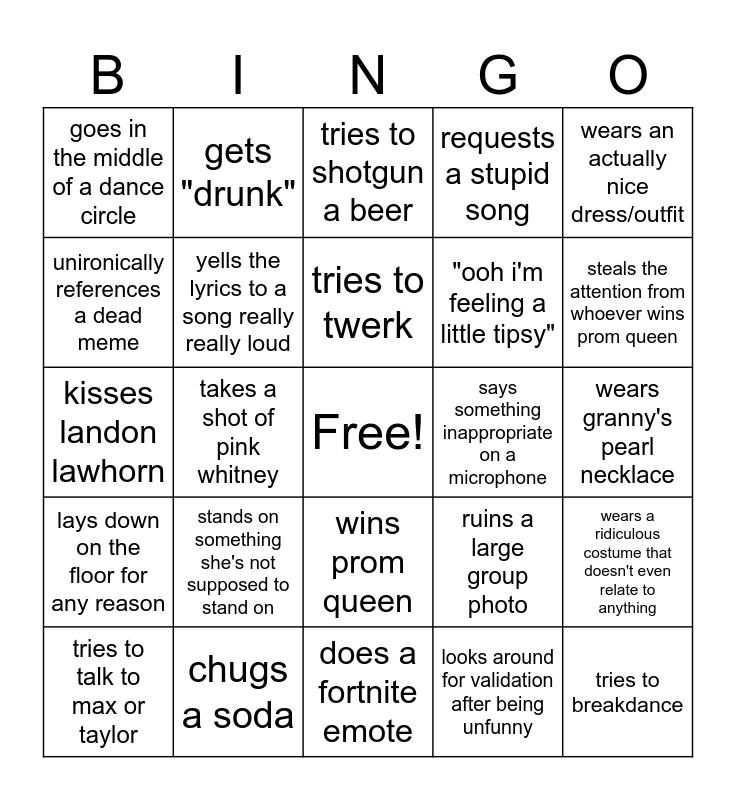 This bingo card has a free space and 24 words: stands on something she's not supposed to stand on, chugs a soda, tries to twerk, tries to talk to max or taylor, wears an actually nice dress/outfit, goes in the middle of a dance circle, unironically references a dead meme, gets "drunk", says something inappropriate on a microphone, wins prom queen, "ooh i'm feeling a little tipsy", kisses landon lawhorn, ruins a large group photo, wears a ridiculous costume that doesn't even relate to anything, yells the lyrics to a song really really loud, looks around for validation after being unfunny, wears granny's pearl necklace, tries to shotgun a beer, steals the attention from whoever wins prom queen, takes a shot of pink whitney, tries to breakdance, lays down on the floor for any reason, requests a stupid song and does a fortnite emote.