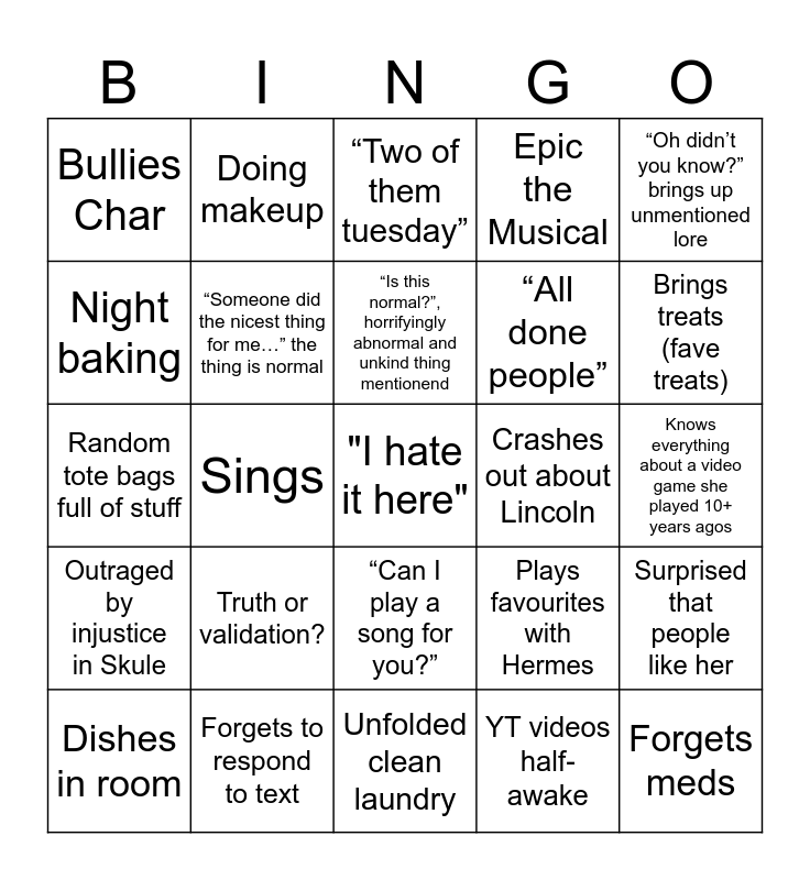 This bingo card has a free space and 36 words: Fun earrings, Crashes out, Emerges from room like a creature, “Someone did the nicest thing for me…” the thing is normal, Plays favourites with Hermes, Outraged by injustice in Skule, “Is this normal?”, horrifyingly abnormal and unkind thing mentionend, Forgoes self-care to worry about other people, “Oh didn’t you know?” brings up unmentioned lore, Asks to be woken up but is already awake, Sings, Epic the Musical, Disappears for almost 24h with no notice or contact, Crashes out about Lincoln, Brings treats (fave treats), Bullies Char, 2 good things and 1 bad thing, Truth or validation?, Forgets meds, “Two of them tuesday”, Knows everything about a video game she played 10+ years agos, Surprised that people like her, Forgets to respond to text, Dishes in room, Unfolded clean laundry, Doing makeup, Random tote bags full of stuff, Older sibling core, “All done people”, Night baking, Voice to text, without clarifying to people around her, Napping, YT videos half-awake, “Can I play a song for you?”, “I gotta lock in” and “I’ll leave it in your capable hands” but it’s clear she is trying to convince herself.