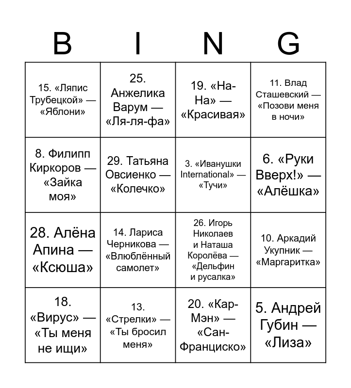 This bingo card has 36 words: Free!, 1. Ирина Аллегрова — «Фотография 9×12», 2. «Агата Кристи» — «Сказочная тайга», 3. «Иванушки International» — «Тучи», 4. «Комбинация» — «Бухгалтер», 5. Андрей Губин — «Лиза», 6. «Руки Вверх!» — «Алёшка», 7. «Иванушки International» — «Тополиный пух», 8. Филипп Киркоров — «Зайка моя», 9. Александр Буйнов — «Падают листья», 10. Аркадий Укупник — «Маргаритка», 11. Влад Сташевский — «Позови меня в ночи», 12. Кай Метов — «Вспомни меня», 13. «Стрелки» — «Ты бросил меня», 14. Лариса Черникова — «Влюблённый самолет», 15. «Ляпис Трубецкой» — «Яблони», 16. Наташа Королёва — «Жёлтые тюльпаны», 17. Demo — «Солнышко», 18. «Вирус» — «Ты меня не ищи», 19. «На-На» — «Красивая», 20. «Кар-Мэн» — «Сан-Франциско», 21. «Маша и медведи» — «Любочка», 22. «Дюна» — «Коммунальная квартира», 23. «Президент & Амазонка» — «А мы ему по морде чайником», 24. «Восток» — «Миражи», 25. Анжелика Варум — «Ля-ля-фа», 26. Игорь Николаев и Наташа Королёва — «Дельфин и русалка», 27. Ирина Салтыкова — «Голубые глазки», 28. Алёна Апина — «Ксюша», 29. Татьяна Овсиенко — «Колечко», 30. «Отпетые мошенники» — «Люби меня», 31. «Гости из будущего» — «Беги от меня», 32. Hi-Fi — «Беспризорник», 33. Алёна Свиридова — «Бедная овечка», 34. Шура — «Отшумели летние дожди» and 35. «Блестящие» — «Там, только там».