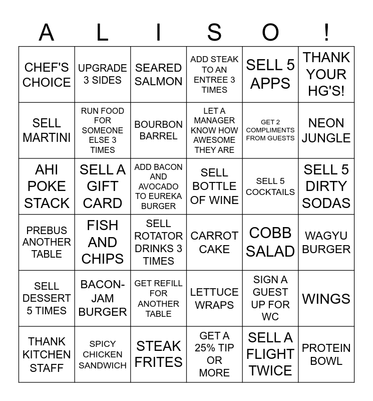 This bingo card has 36 words: LETTUCE WRAPS, GET REFILL FOR ANOTHER TABLE, GET A 25% TIP OR MORE, SELL MARTINI, PREBUS ANOTHER TABLE, SELL BOTTLE OF WINE, RUN FOOD FOR SOMEONE ELSE 3 TIMES, STEAK FRITES, SELL 5 APPS, SIGN A GUEST UP FOR WC, NEON JUNGLE, ADD STEAK TO AN ENTREE 3 TIMES, WINGS, SELL A GIFT CARD, LET A MANAGER KNOW HOW AWESOME THEY ARE, CHEF'S CHOICE, SELL DESSERT 5 TIMES, SELL 5 COCKTAILS, AHI POKE STACK, SEARED SALMON, ADD BACON AND AVOCADO TO EUREKA BURGER, FISH AND CHIPS, CARROT CAKE, SELL ROTATOR DRINKS 3 TIMES, COBB SALAD, UPGRADE 3 SIDES, GET 2 COMPLIMENTS FROM GUESTS, SPICY CHICKEN SANDWICH, BOURBON BARREL, THANK YOUR HG'S!, PROTEIN BOWL, THANK KITCHEN STAFF, WAGYU BURGER, SELL 5 DIRTY SODAS, BACON-JAM BURGER and SELL A FLIGHT TWICE.
