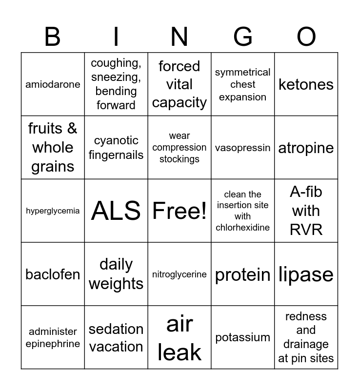 This bingo card has a free space and 46 words: Elevate the HOB, redness and drainage at pin sites, bladder distention, air leak, daily weights, glucose & carbohydrates, coughing, sneezing, bending forward, CD4-T cell count, fruits & whole grains, urine specific gravity, cyanotic fingernails, symmetrical chest expansion, lipase, protein, s3 heart sound, electrocardiogram, wear compression stockings, clean the insertion site with chlorhexidine, excessive urine output, ketones, ALS, potassium, amiodarone, vasopressin, glargine, atropine, administer epinephrine, metformin, nitroglycerine, baclofen, lispro, INR, hemoglobin, A1C, oral care, sedation vacation, A-fib with RVR, demeclocycline, thrombocytopenia, circuit disconnection, respiratory tract infection, forced vital capacity, hyperglycemia, Valsalva maneuver, dairy products and vitamin b12 deficiency.