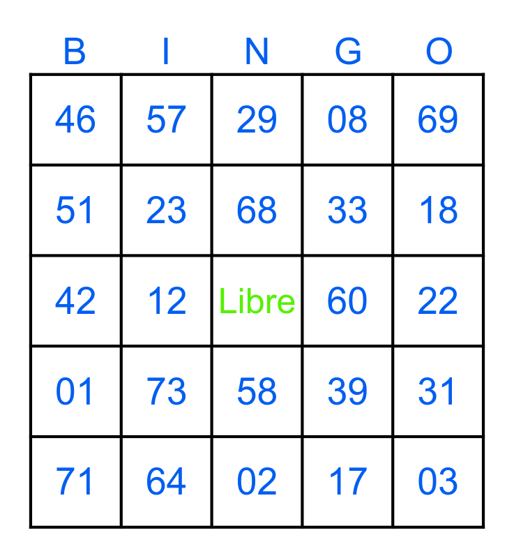 This bingo card has a free space and 24 words: 73, 64, 68, 71, 69, 46, 51, 57, 60, 58, 33, 42, 39, 31, 23, 17, 22, 29, 18, 12, 03, 01, 08 and 02.
