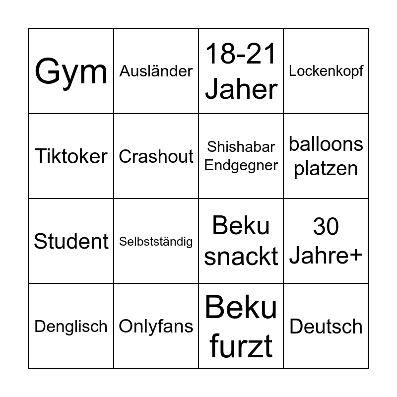 This bingo card has 16 words: Onlyfans, 30 Jahre+, 18-21 Jaher, Gym, Student, Ausländer, Beku snackt, Beku furzt, Tiktoker, Crashout, Denglisch, Lockenkopf, Selbstständig, balloons platzen, Shishabar Endgegner and Deutsch.