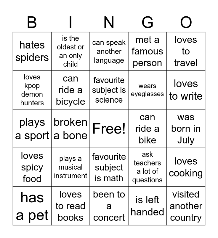 This bingo card has a free space and 24 words: plays a musical instrument, loves to read books, favourite subject is science, has a pet, loves to travel, hates spiders, loves kpop demon hunters, is the oldest or an only child, can ride a bike, favourite subject is math, wears eyeglasses, plays a sport, ask teachers a lot of questions, loves cooking, can ride a bicycle, is left handed, was born in July, can speak another language, loves to write, broken a bone, visited another country, loves spicy food, met a famous person and been to a concert.