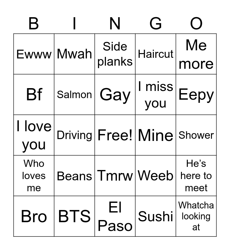 This bingo card has a free space and 24 words: Beans, BTS, Gay, Bro, Me more, Ewww, Bf, Mwah, Mine, Tmrw, I miss you, I love you, Weeb, He’s here to meet, Salmon, Sushi, Shower, Side planks, Eepy, Driving, Whatcha looking at, Who loves me, Haircut and El Paso.