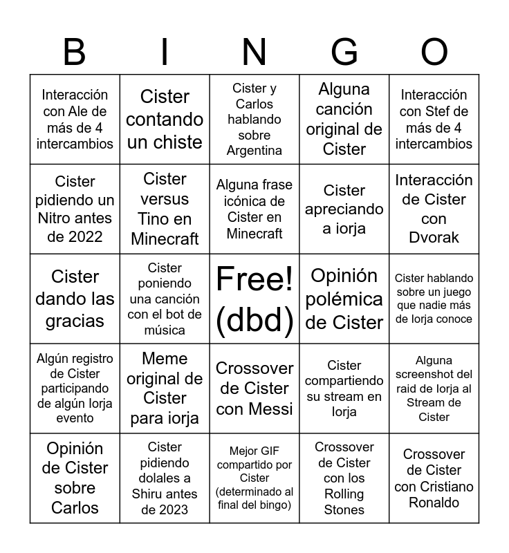 This bingo card has a free space and 24 words: Meme original de Cister para iorja, Cister pidiendo dolales a Shiru antes de 2023, Alguna frase icónica de Cister en Minecraft, Opinión de Cister sobre Carlos, Interacción con Stef de más de 4 intercambios, Interacción con Ale de más de 4 intercambios, Cister pidiendo un Nitro antes de 2022, Cister contando un chiste, Opinión polémica de Cister, Crossover de Cister con Messi, Cister apreciando a iorja, Cister dando las gracias, Cister compartiendo su stream en Iorja, Alguna screenshot del raid de Iorja al Stream de Cister, Cister versus Tino en Minecraft, Crossover de Cister con los Rolling Stones, Cister hablando sobre un juego que nadie más de Iorja conoce, Cister y Carlos hablando sobre Argentina, Interacción de Cister con Dvorak, Cister poniendo una canción con el bot de música, Crossover de Cister con Cristiano Ronaldo, Algún registro de Cister participando de algún Iorja evento, Alguna canción original de Cister and Mejor GIF compartido por Cister (determinado al final del bingo).