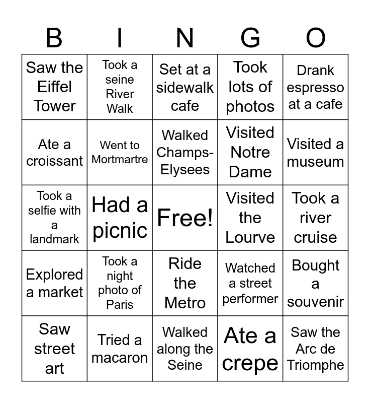 This bingo card has a free space and 24 words: Took a night photo of Paris, Tried a macaron, Walked Champs-Elysees, Saw street art, Drank espresso at a cafe, Saw the Eiffel Tower, Ate a croissant, Took a seine River Walk, Visited the Lourve, Ride the Metro, Visited Notre Dame, Took a selfie with a landmark, Watched a street performer, Bought a souvenir, Went to Mortmartre, Ate a crepe, Took a river cruise, Set at a sidewalk cafe, Visited a museum, Had a picnic, Saw the Arc de Triomphe, Explored a market, Took lots of photos and Walked along the Seine.