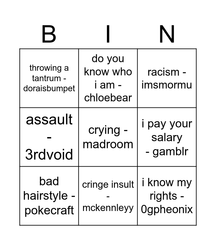 This bingo card has a free space and 8 words: i pay your salary - gamblr, racism - imsmormu, do you know who i am - chloebear, bad hairstyle - pokecraft, throwing a tantrum - doraisbumpet, i know my rights - 0gpheonix, assault - 3rdvoid and cringe insult - mckennleyy.