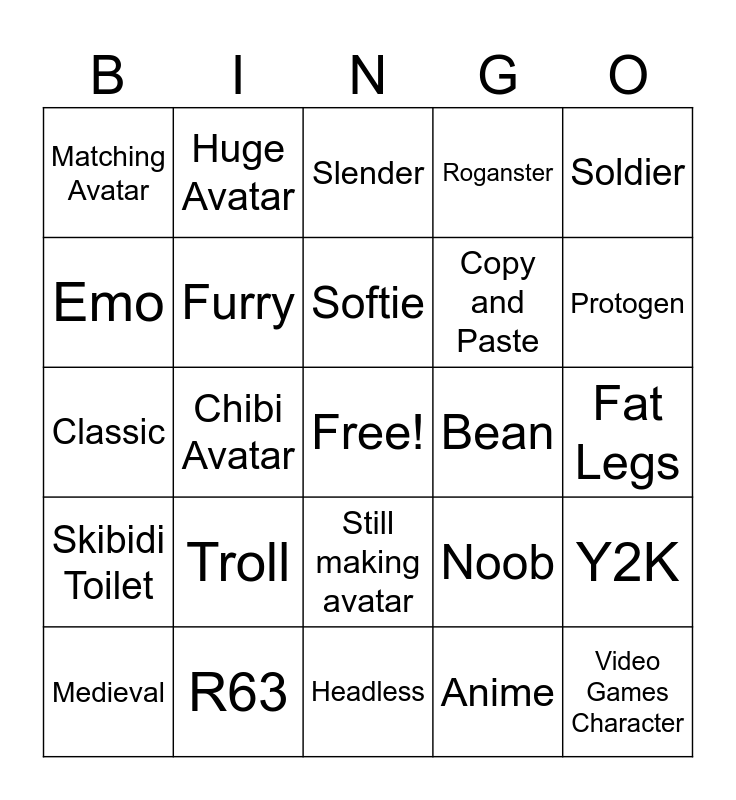 This bingo card has a free space and 24 words: Troll, R63, Softie, Medieval, Soldier, Matching Avatar, Emo, Huge Avatar, Bean, Still making avatar, Copy and Paste, Classic, Noob, Y2K, Furry, Anime, Fat Legs, Slender, Protogen, Chibi Avatar, Video Games Character, Skibidi Toilet, Roganster and Headless.