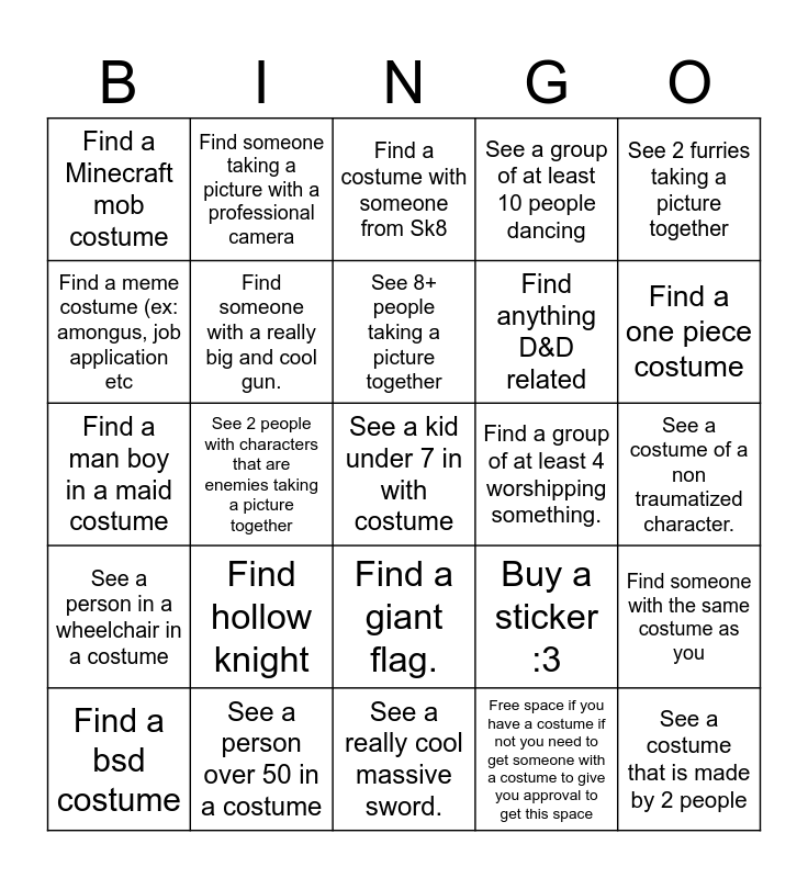 This bingo card has 25 words: Find hollow knight, See a really cool massive sword., See 8+ people taking a picture together, Find a bsd costume, See 2 furries taking a picture together, Find a Minecraft mob costume, Find a meme costume (ex: amongus, job application etc, Find someone taking a picture with a professional camera, Find a group of at least 4 worshipping something., Find a giant flag., Find anything D&D related, Find a man boy in a maid costume, Buy a sticker :3, Find someone with the same costume as you, Find someone with a really big and cool gun., See a costume that is made by 2 people, See a costume of a non traumatized character., Find a costume with someone from Sk8, Find a one piece costume, See 2 people with characters that are enemies taking a picture together, See a kid under 7 in with costume, See a person over 50 in a costume, See a person in a wheelchair in a costume, See a group of at least 10 people dancing and Free space if you have a costume if not you need to get someone with a costume to give you approval to get this space.