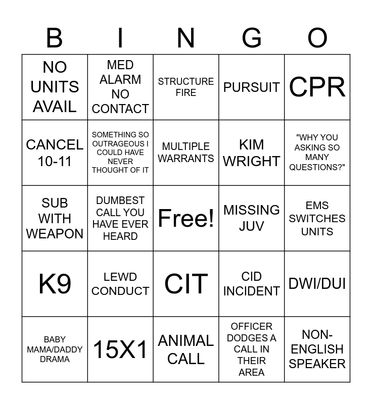 This bingo card has a free space and 24 words: LEWD CONDUCT, 15X1, MULTIPLE WARRANTS, BABY MAMA/DADDY DRAMA, CPR, NO UNITS AVAIL, CANCEL 10-11, MED ALARM NO CONTACT, MISSING JUV, CIT, KIM WRIGHT, SUB WITH WEAPON, CID INCIDENT, DWI/DUI, SOMETHING SO OUTRAGEOUS I COULD HAVE NEVER THOUGHT OF IT, OFFICER DODGES A CALL IN THEIR AREA, EMS SWITCHES UNITS, STRUCTURE FIRE, "WHY YOU ASKING SO MANY QUESTIONS?", DUMBEST CALL YOU HAVE EVER HEARD, NON-ENGLISH SPEAKER, K9, PURSUIT and ANIMAL CALL.