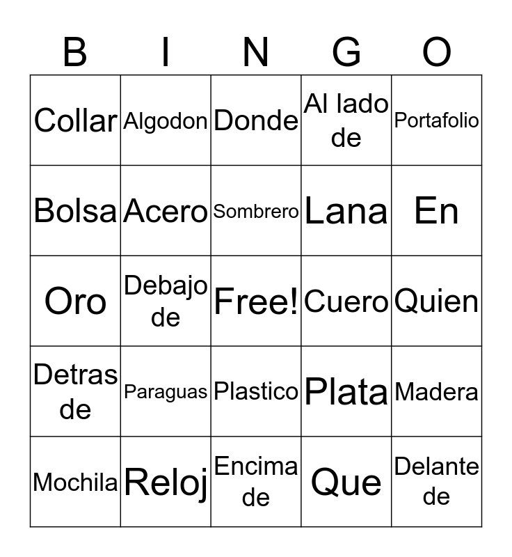 This bingo card has a free space and 24 words: Paraguas, Reloj, Sombrero, Mochila, Portafolio, Collar, Bolsa, Algodon, Cuero, Plastico, Lana, Oro, Plata, Madera, Acero, Que, Quien, Donde, En, Debajo de, Delante de, Detras de, Al lado de and Encima de.