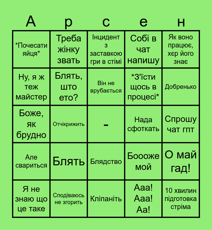 This bingo card has a free space and 24 words: Блять, Сподіваюсь не згорить, Він не врубається, Я не знаю що це таке, Як воно працює, хєр його знає, *Почесати яйця*, Ну, я ж теж майстер, Треба жінку звать, Нада сфоткать, Блядство, *З'їсти щось в процесі*, Боже, як брудно, Боооже мой, О май гад!, Блять, што ето?, Ааа! Ааа! Аа!, Спрошу чат гпт, Інцидент з заставкою гри в стімі, Добренько, Отчікрижить, 10 хвилин підготовка стріма, Але свариться, Собі в чат напишу and Кліпаніть.