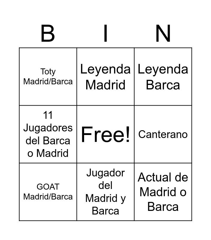 This bingo card has a free space and 8 words: Canterano, Leyenda Barca, Leyenda Madrid, GOAT Madrid/Barca, Toty Madrid/Barca, Actual de Madrid o Barca, 11 Jugadores del Barca o Madrid and Jugador del Madrid y Barca.