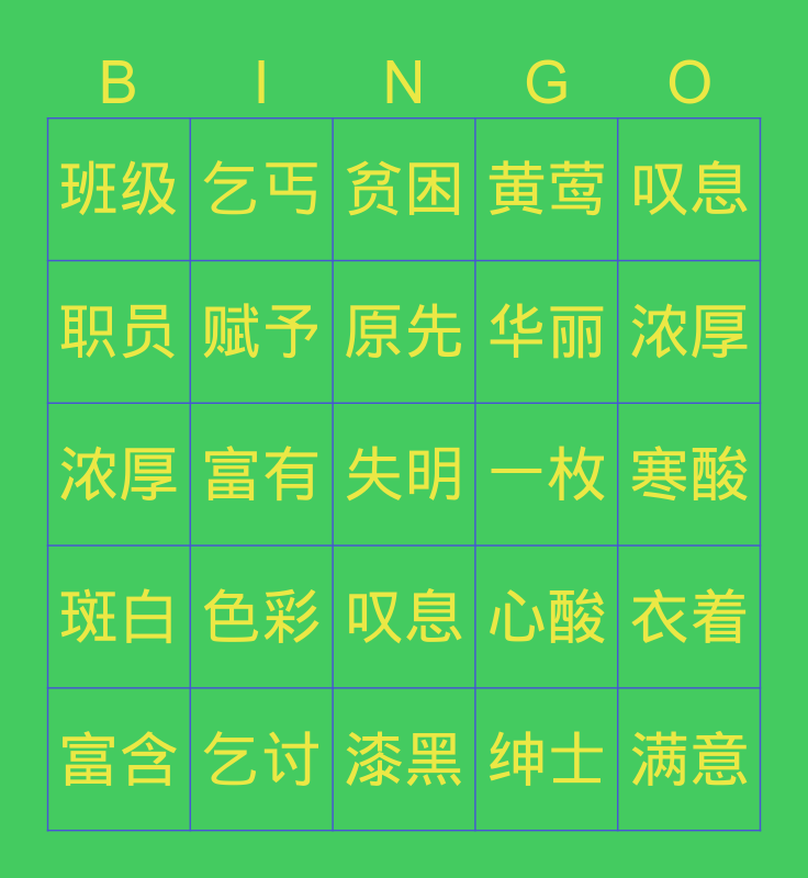This bingo card has 25 words: 斑白, 乞讨, 失明, 绅士, 叹息, 班级, 乞丐, 贫困, 一枚, 衣着, 职员, 赋予, 漆黑, 心酸, 浓厚, 富含, 富有, 原先, 华丽, 寒酸, 浓厚, 色彩, 叹息, 黄莺 and 满意.