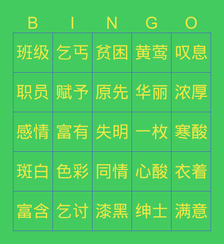 This bingo card has 25 words: 斑白, 乞讨, 失明, 绅士, 叹息, 班级, 乞丐, 贫困, 一枚, 衣着, 职员, 赋予, 漆黑, 心酸, 浓厚, 富含, 富有, 原先, 华丽, 寒酸, 感情, 色彩, 同情, 黄莺 and 满意.