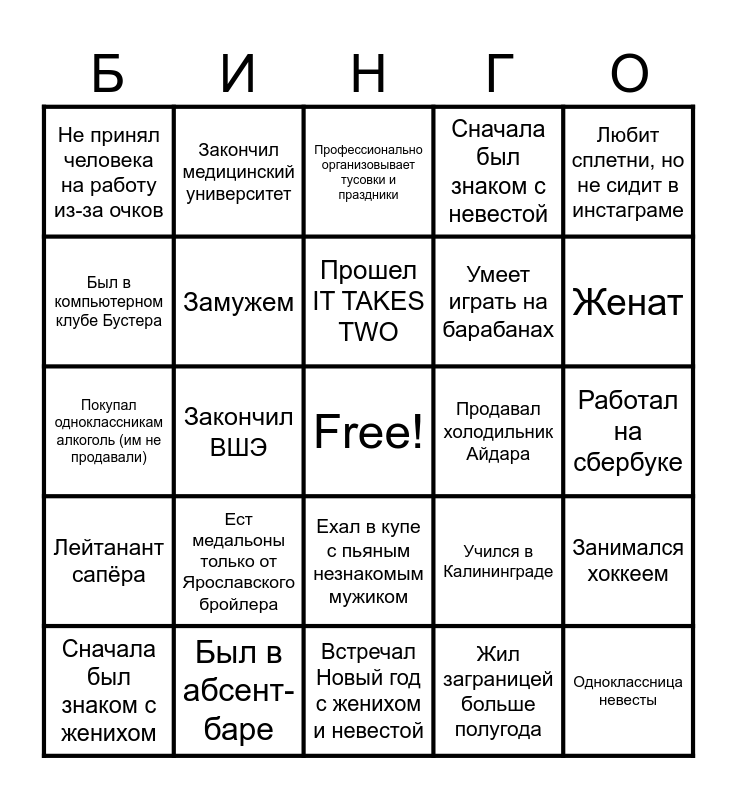 This bingo card has a free space and 74 words: Младше невесты, Познакомился с женихом и невестой одновременно, Профессионально организовывает тусовки и праздники, Закончил МИФИ, Ходит на акробатику и паркур, Выбирал с невестой платье, Кореной москвич, Был на премьерном показе фильма в КАРО Октябрь, Сначала был знаком с женихом, Ходил в Турции в футболке Шрека, Ездил ради концерта заграницу, Попался на учебную фишинговую атаку, Прошел IT TAKES TWO, Был в компьютерном клубе Бустера, Играет на гитаре, Закончил ВШЭ, Закончил универ с красным дипломом, Женат, Был в Мышкине, Покупал одноклассникам алкоголь (им не продавали), Замужем, Закончил медицинский университет, Сначала был знаком с невестой, Дома живет два кота, Одноклассница невесты, Сдал ЕГЭ на 100 баллов, Предпочитает пиву коньяк, Служил в армии (не военная кафедра), Смотрел водитель-олигарх (с Павлом Прилучным), Прошел 100 тысяч шагов за день, Любит сплетни, но не сидит в инстаграме, Ездит в командировки во Францию, Учится на психолога, Привез невесте ветрушку из Геленджика, Рассадили с невестой в универе (много хихикали), Жил заграницей больше полугода, Знает немецкий язык, Закончил МГУ, Ходил в длительные походы, Профессионально катается на роликах, Встречал Новый год с женихом и невестой, Был в абсент-баре, Мастер битбокса, Был на мальчишнике, Был в Сербии, Не принял человека на работу из-за очков, Служил вместе с женихом, Ест медальоны только от Ярославского бройлера, Работал вместе с невестой, Играл с невестой в сквош, Лучший кондитер, Занимается конным спортом, Работал на сбербуке, Прошел Duolingo, Учился в ВШЭ, Знает все про Ярославль, Ехал в купе с пьяным незнакомым мужиком, Отдыхал на Мальдивах, Знает как оживить гортензию, Занимался хоккеем, Умеет играть на барабанах, Занял первое место в квизе, Лейтанант сапёра, Строил унитаз в VR, Продавал холодильник Айдара, Жила в Питере, Дома много настолок, Был в сборной по настольному теннису, Учился в Калининграде, Ходит на татарские тусовки, Любимчик бабушки Егора Корекова, Вчера вышла замуж, Вчера женился and Плавал в Долине реки Чератновки.
