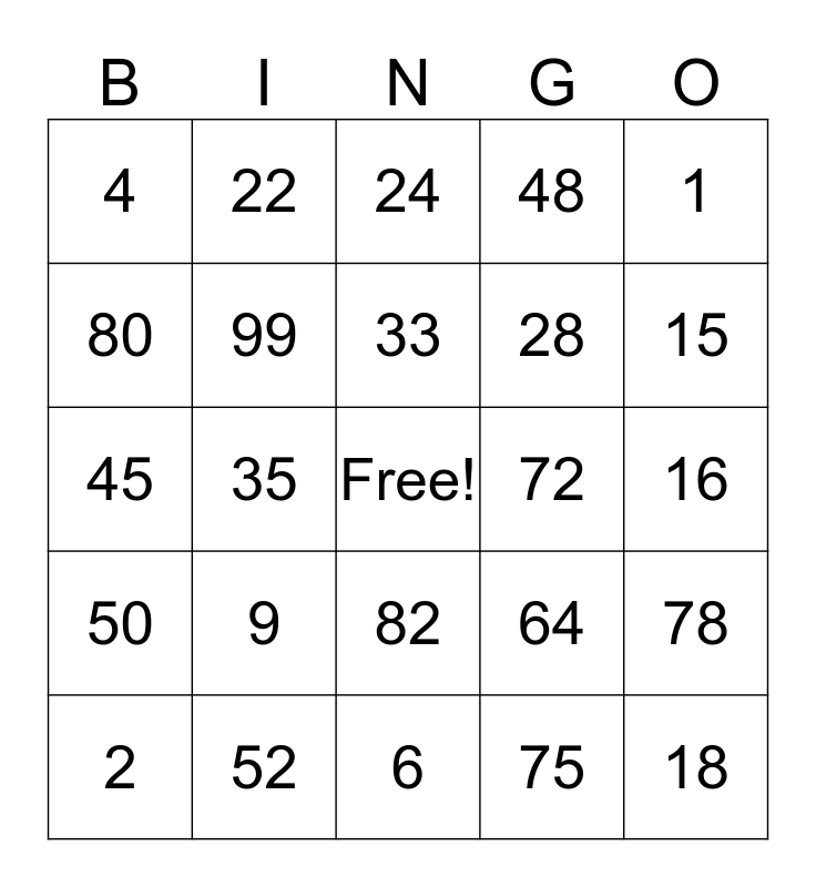 This bingo card has a free space and 24 words: 9, 52, 33, 2, 1, 4, 80, 22, 72, 82, 28, 45, 64, 78, 99, 75, 16, 24, 15, 35, 18, 50, 48 and 6.