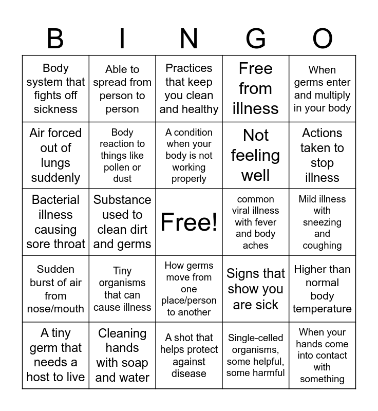 This bingo card has a free space and 24 words: A tiny germ that needs a host to live, Tiny organisms that can cause illness, A condition when your body is not working properly, Single-celled organisms, some helpful, some harmful, When germs enter and multiply in your body, Body system that fights off sickness, Able to spread from person to person, Practices that keep you clean and healthy, common viral illness with fever and body aches, Mild illness with sneezing and coughing, Bacterial illness causing sore throat, Body reaction to things like pollen or dust, Signs that show you are sick, Higher than normal body temperature, Air forced out of lungs suddenly, Cleaning hands with soap and water, A shot that helps protect against disease, Free from illness, Actions taken to stop illness, Sudden burst of air from nose/mouth, Substance used to clean dirt and germs, How germs move from one place/person to another, Not feeling well and When your hands come into contact with something.