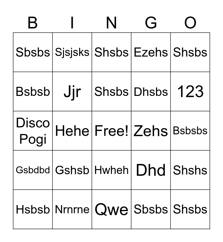 This bingo card has a free space and 40 words: Unwritten, Disco Pogi, Jdhd, Jjr, Nrnrne, Hwheh, Shsbs, Nrnene, Shsbs, Gsbdbd, Hehe, Ezehs, Shsbs, Bsbsbs, Zehs, Gshsb, Hshsb, Sbsbs, Sbsbs, Shsbs, Shshs, Sbsbs, Dhsbs, Bsbsb, Hsbs, Djdjd, Djdjd, Djdjd, Jsbs, Dudjdhd, Jdhdj, Hsbsb, Sjsjs, Dhd, 123, Qwe, W, Smsjsjs, Sjsjsks and Sjsjs.