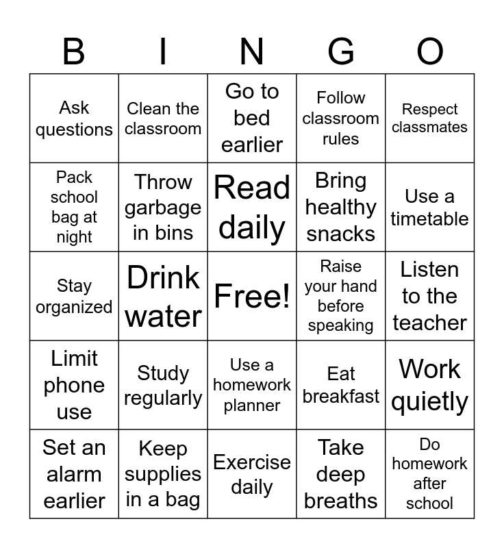 This bingo card has a free space and 24 words: Study regularly, Keep supplies in a bag, Read daily, Set an alarm earlier, Respect classmates, Ask questions, Pack school bag at night, Clean the classroom, Raise your hand before speaking, Use a homework planner, Bring healthy snacks, Stay organized, Eat breakfast, Work quietly, Throw garbage in bins, Take deep breaths, Listen to the teacher, Go to bed earlier, Use a timetable, Drink water, Do homework after school, Limit phone use, Follow classroom rules and Exercise daily.