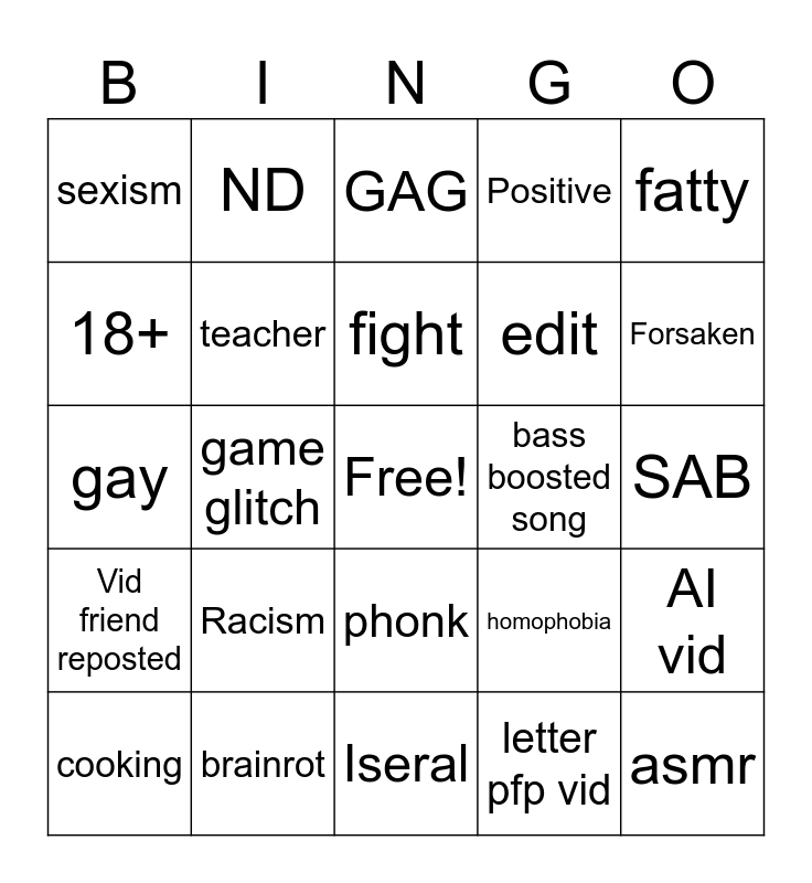 This bingo card has a free space and 24 words: Racism, brainrot, fight, cooking, fatty, sexism, 18+, ND, bass boosted song, phonk, edit, gay, homophobia, AI vid, teacher, letter pfp vid, SAB, GAG, Forsaken, game glitch, asmr, Vid friend reposted, Positive and Iseral.