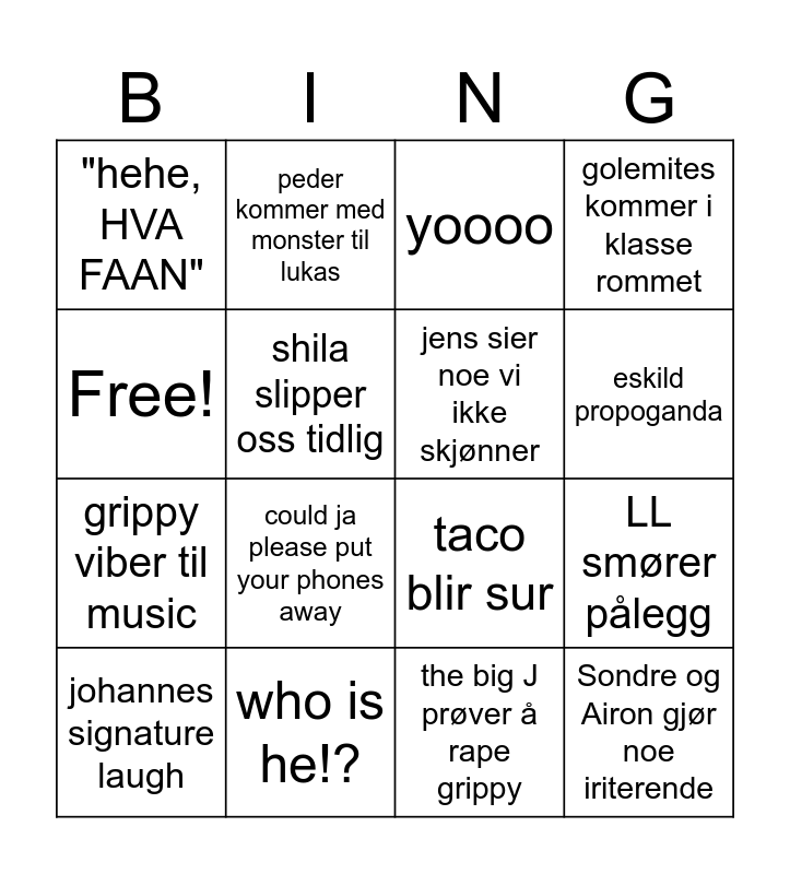 This bingo card has 16 words: who is he!?, LL smører pålegg, yoooo, "hehe, HVA FAAN", grippy viber til music, peder kommer med monster til lukas, taco blir sur, the big J prøver å rape grippy, Free!, shila slipper oss tidlig, johannes signature laugh, golemites kommer i klasse rommet, could ja please put your phones away, eskild propoganda, jens sier noe vi ikke skjønner and Sondre og Airon gjør noe iriterende.