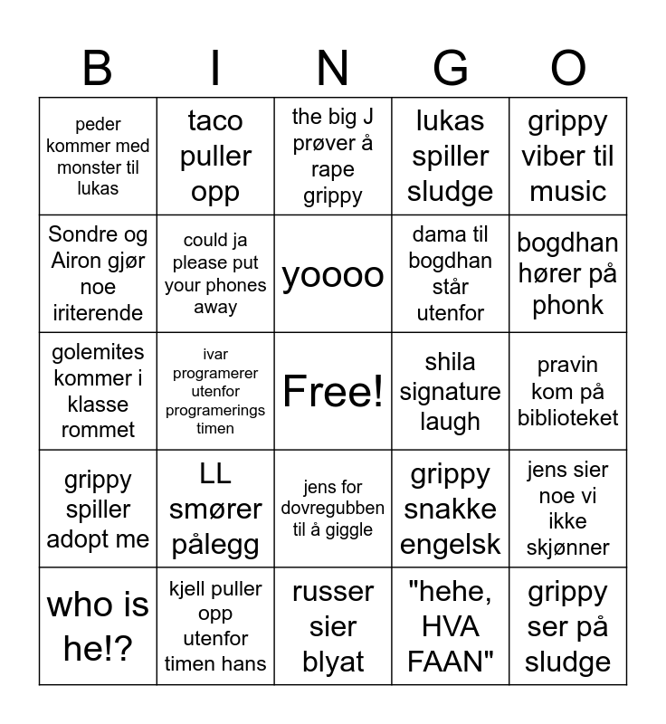 This bingo card has a free space and 24 words: who is he!?, LL smører pålegg, yoooo, "hehe, HVA FAAN", grippy viber til music, peder kommer med monster til lukas, taco puller opp, the big J prøver å rape grippy, shila signature laugh, pravin kom på biblioteket, golemites kommer i klasse rommet, could ja please put your phones away, grippy snakke engelsk, jens sier noe vi ikke skjønner, Sondre og Airon gjør noe iriterende, kjell puller opp utenfor timen hans, russer sier blyat, lukas spiller sludge, bogdhan hører på phonk, grippy spiller adopt me, ivar programerer utenfor programerings timen, jens for dovregubben til å giggle, dama til bogdhan står utenfor and grippy ser på sludge.