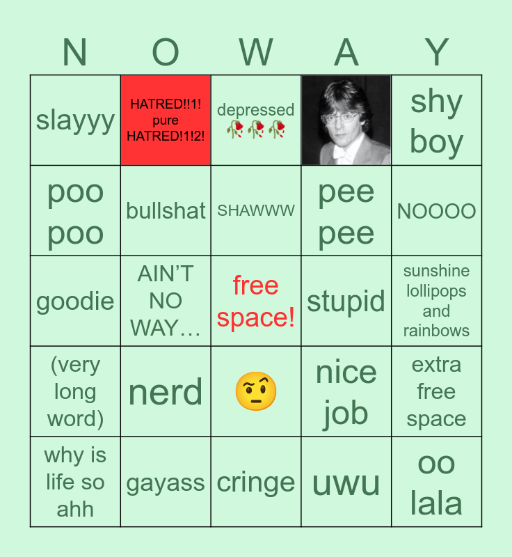 This bingo card has 1 images, a free space and 28 words: why is life so ahh, fack, AIN’T NO WAY…, AYO, slayyy, depressed 🥀🥀🥀, bullshat, nerd, stupid, gayass, sunshine lollipops and rainbows, oo lala, cringe, uwu, NOOOO, fart, 🤨, (very long word), shy boy, goodie, nice job, gorls, pee pee, poo poo, HATRED!!1! pure HATRED!1!2!, extra free space, SHAWWW and PEACE AND LOVE.