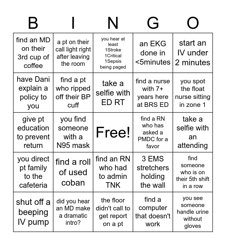 This bingo card has a free space and 24 words: find a roll of used coban, did you hear an MD make a dramatic intro?, take a selfie with ED RT, shut off a beeping IV pump, start an IV under 2 minutes, find an MD on their 3rd cup of coffee, have Dani explain a policy to you, a pt on their call light right after leaving the room, find a RN who has asked a PMDC for a favor, find an RN who had to admin TNK, find a nurse with 7+ years here at BRS ED, give pt education to prevent return, 3 EMS stretchers holding the wall, find someone who is on their 5th shift in a row, find a pt who ripped off their BP cuff, find a computer that doesn't work, take a selfie with an attending, you hear at least 1Stroke 1Critical 1Sepsis being paged, you spot the float nurse sitting in zone 1, you find someone with a N95 mask, you see someone handle urine without gloves, you direct pt family to the cafeteria, an EKG done in <5minutes and the floor didn't call to get report on a pt.