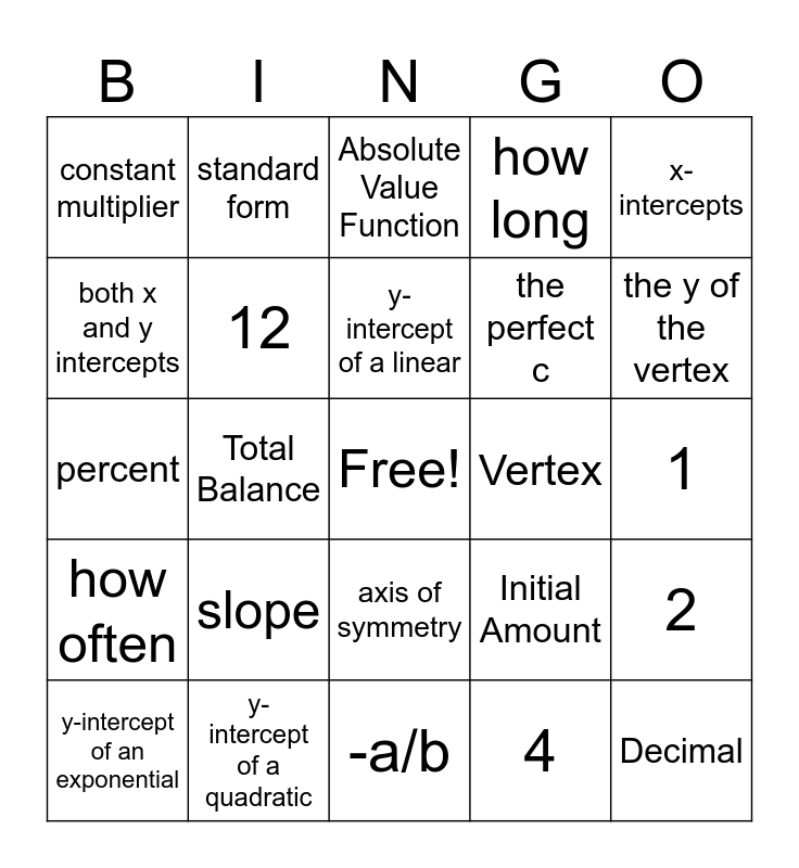 This bingo card has a free space and 24 words: slope, y-intercept of a quadratic, y-intercept of a linear, y-intercept of an exponential, x-intercepts, constant multiplier, both x and y intercepts, standard form, Vertex, axis of symmetry, the perfect c, percent, Initial Amount, 2, 12, 4, 1, Absolute Value Function, the y of the vertex, Total Balance, Decimal, how often, how long and -a/b.