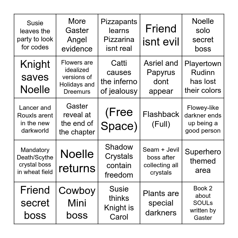 This bingo card has a free space and 24 words: Noelle returns, Cowboy Mini boss, Catti causes the inferno of jealousy, Friend secret boss, Noelle solo secret boss, Susie leaves the party to look for codes, Knight saves Noelle, More Gaster Angel evidence, Flashback (Full), Shadow Crystals contain freedom, Asriel and Papyrus dont appear, Lancer and Rouxls arent in the new darkworld, Seam + Jevil boss after collecting all crystals, Superhero themed area, Flowers are idealized versions of Holidays and Dreemurs, Plants are special darkners, Flowey-like darkner ends up being a good person, Pizzapants learns Pizzarina isnt real, Playertown Rudinn has lost their colors, Gaster reveal at the end of the chapter, Book 2 about SOULs written by Gaster, Mandatory Death/Scythe crystal boss in wheat field, Friend isnt evil and Susie thinks Knight is Carol.