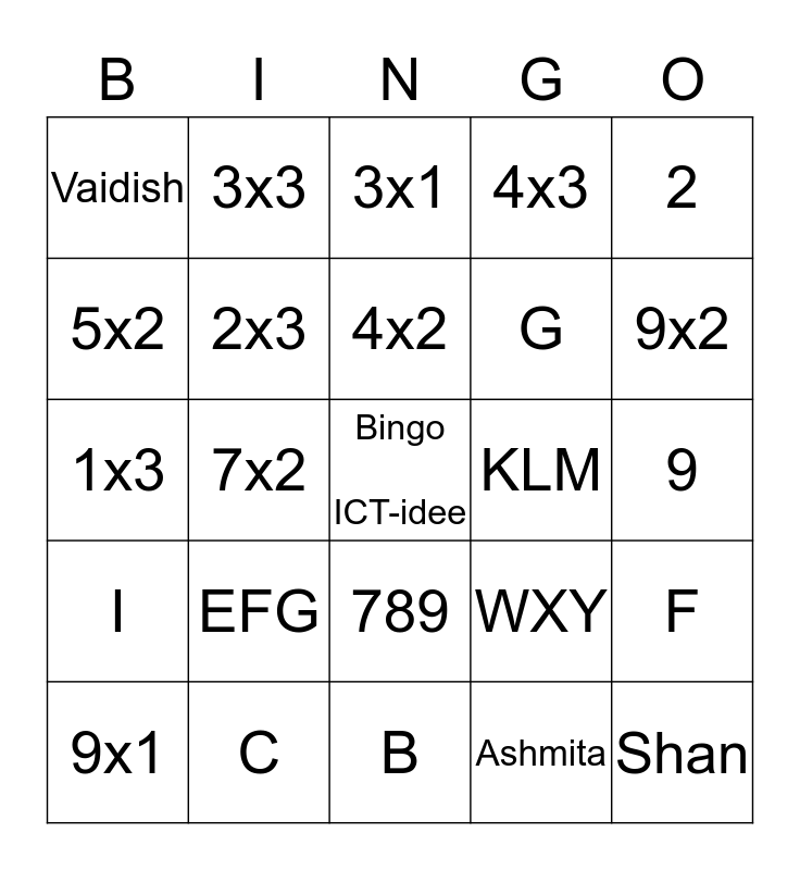 This bingo card has a free space and 74 words: 1x1, 2x1, 3x1, 4x1, 5x1, 6x1, 7x1, 8x1, 9x1, 10x1, 1x2, 2x2, 4x2, 5x2, 6x2, 7x2, 8x2, 9x2, 10x2, 1x3, 2x3, 3x3, 4x3, 3x2, Shan, Sujithra, Ganesh, Ramasamy, Vijayaa, 1, 2, 3, 4, 5, Kavin, Ashmita, Roshini, Nidhi, Vaibhav, A, B, C, D, E, Venkat, Vaidish, ABC, EFG, HIJ, 6, 7, 8, 9, 0, 123, 456, 789, 145, 190, F, G, H, I, J, KLM, NOP, QRS, TUV, WXY, K, L, M, N and O.