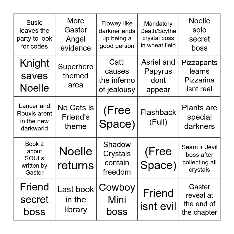 This bingo card has a free space and 25 words: Noelle returns, Cowboy Mini boss, Catti causes the inferno of jealousy, Friend secret boss, Noelle solo secret boss, Susie leaves the party to look for codes, Knight saves Noelle, More Gaster Angel evidence, Flashback (Full), Shadow Crystals contain freedom, Asriel and Papyrus dont appear, Lancer and Rouxls arent in the new darkworld, (Free Space), Seam + Jevil boss after collecting all crystals, Superhero themed area, Flowers are idealized versions of Holidays and Dreemurs, Plants are special darkners, Flowey-like darkner ends up being a good person, Pizzapants learns Pizzarina isnt real, No Cats is Friend's theme, Gaster reveal at the end of the chapter, Last book in the library, Book 2 about SOULs written by Gaster, Mandatory Death/Scythe crystal boss in wheat field and Friend isnt evil.