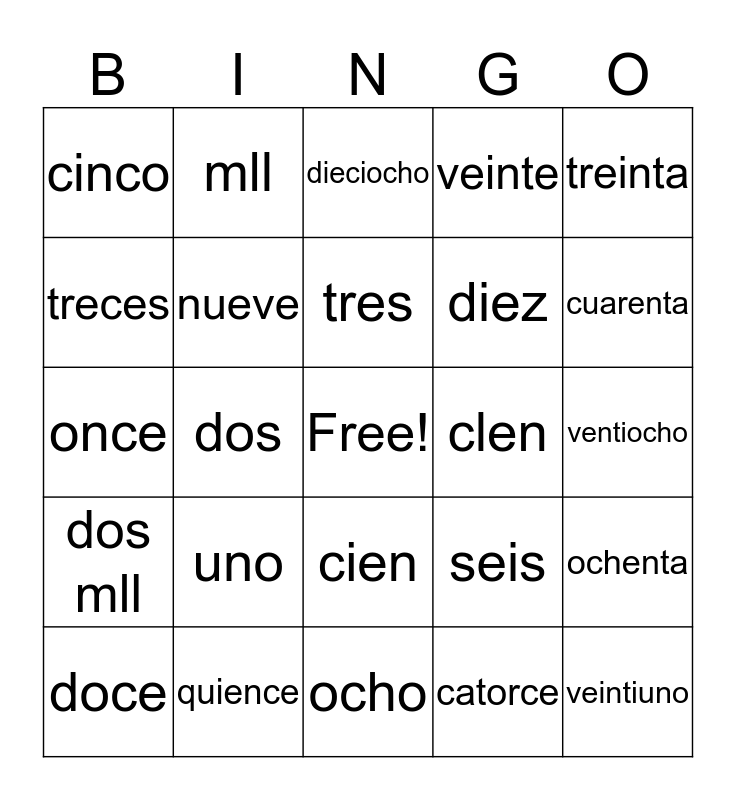 This bingo card has a free space and 24 words: uno, quience, tres, doce, treinta, cinco, treces, mll, clen, cien, diez, once, seis, ochenta, nueve, catorce, ventiocho, dieciocho, cuarenta, dos, veintiuno, dos mll, veinte and ocho.