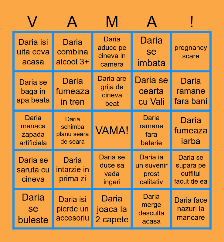 This bingo card has a free space and 24 words: Daria intarzie in prima zi, Daria isi pierde un accesoriu, Daria are grija de cineva beat, Daria se buleste, pregnancy scare, Daria isi uita ceva acasa, Daria se baga in apa beata, Daria combina alcool 3+, Daria ramane fara baterie, Daria se duce sa vada ingeri, Daria se cearta cu Vali, Daria manaca zapada artificiala, Daria ia un suvenir prost calitativ, Daria se supara pe outfitul facut de ea, Daria fumeaza in tren, Daria merge desculta acasa, Daria fumeaza iarba, Daria aduce pe cineva in camera, Daria ramane fara bani, Daria schimba planu seara de seara, Daria face nazuri la mancare, Daria se saruta cu cineva, Daria se imbata and Daria joaca la 2 capete.