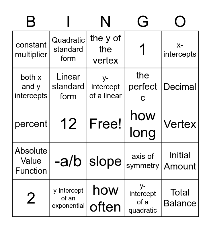This bingo card has a free space and 26 words: slope, y-intercept of a quadratic, y-intercept of a linear, y-intercept of an exponential, x-intercepts, constant multiplier, both x and y intercepts, Quadratic standard form, Vertex, axis of symmetry, the perfect c, percent, Initial Amount, 2, 12, 4, 1, Absolute Value Function, the y of the vertex, Total Balance, Decimal, how often, how long, -a/b, Linear standard form and slope intercept form.
