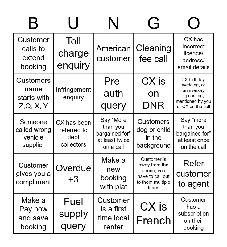 This bingo card has a free space and 28 words: Refer customer to agent, Stolen Vehicle, CX is on DNR, CX is French, Customers name starts with Z,Q, X, Y, American customer, Toll charge enquiry, Customer gives you a compliment, Customers dog or child in the background, Make a Pay now and save booking, Someone called wrong vehicle supplier, Cleaning fee call, Fuel supply query, Customer is a first time local renter, CX birthday, wedding, or anniversay upcoming, mentioned by you or CX on the call, Customer gets your name wrong, Overdue +3, Infringement enquiry, Pre-auth query, Make a new booking with plat, Customer calls to extend booking, Customer puts you on hold, Customer has a subscription on their booking, CX has been referred to debt collectors, Say "more than you bargained for" at least once on the call, Customer is away from the phone, you have to call out to them multiple times, CX has incorrect licence/ address/ email details and Customer calls to cancel booking.