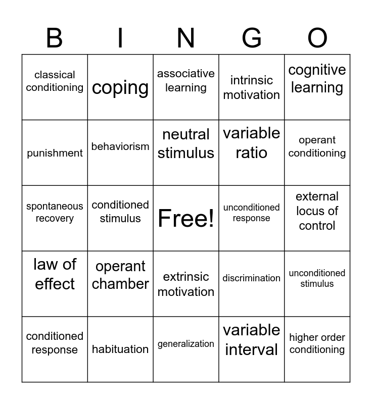 This bingo card has a free space and 29 words: learning, habituation, associative learning, stimulus, cognitive learning, classical conditioning, behaviorism, neutral stimulus, unconditioned response, unconditioned stimulus, conditioned response, conditioned stimulus, variable interval, higher order conditioning, spontaneous recovery, fixed interval, generalization, discrimination, operant conditioning, law of effect, operant chamber, reinforcement, variable ratio, external locus of control, punishment, coping, extrinsic motivation, intrinsic motivation and coping.