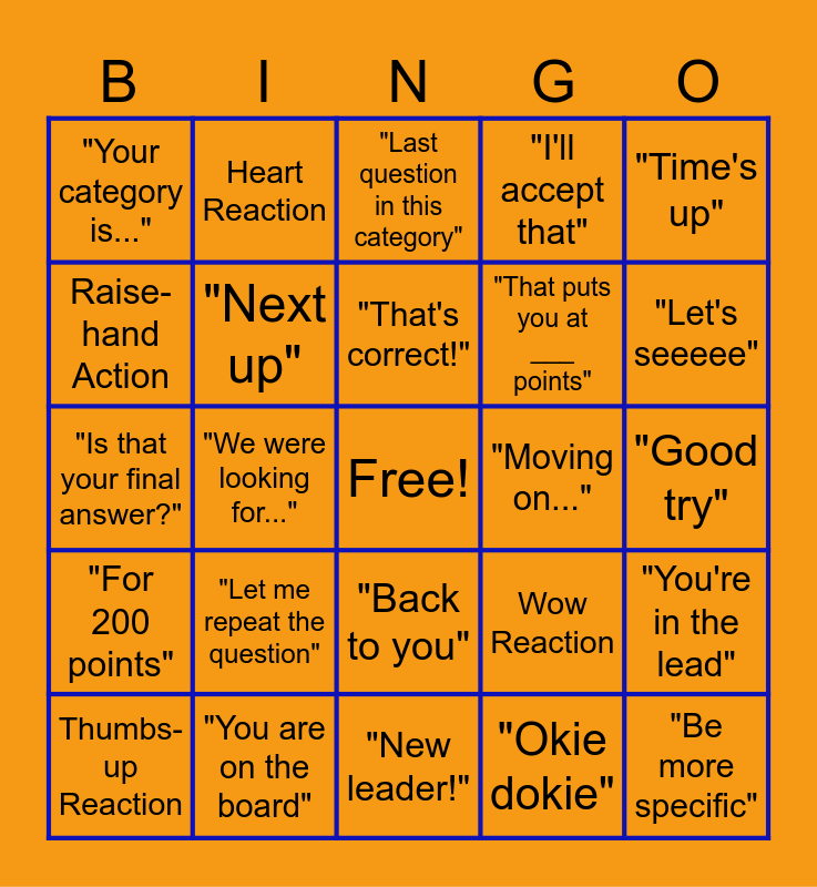 This bingo card has a free space and 41 words: "Let's go", "Is that your final answer?", "Lock it in", "Next up", "You are on the board", "Back to you", "That's correct!", "Not Quite", "Time's up", "For 200 points", "We were looking for...", "I'll accept that", "Be more specific", "Good try", "Moving on...", "Let me repeat the question", "Here is the question", "Your category is...", "Off the board", "Last question in this category", "You're in the lead", "We have a tie", "New leader!", "That puts you at ___ points", "Back to the board", "Alright, alright, alright", "Okie dokie", "And here we goooooo!", "Let's seeeee", "Well, well, well", Clap Reaction, Heart Reaction, Thumbs-up Reaction, Laugh Reaction, Wow Reaction, Raise-hand Action, Someone forgets to answer in question form, same player answers 2 questions correctly in a row, A question goes unanswered, Someone gets the highest-value question correct and Someone gets the lowest-value questions wrong.