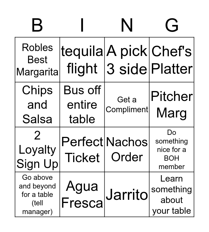 This bingo card has 16 words: Agua Fresca, Do something nice for a BOH member, A pick 3 side, Robles Best Margarita, 2 Loyalty Sign Up, tequila flight, Nachos Order, Jarrito, Chips and Salsa, Bus off entire table, Go above and beyond for a table (tell manager), Chef's Platter, Perfect Ticket, Pitcher Marg, Get a Compliment and Learn something about your table.