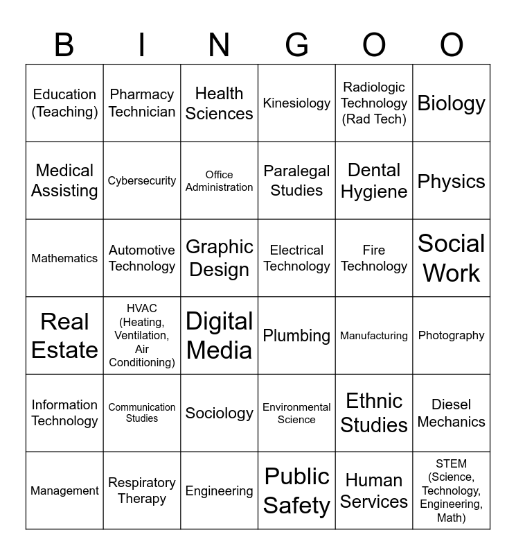 This bingo card has 77 words: Free!, STEM (Science, Technology, Engineering, Math), Health Sciences, Business, Office Services & Law, Arts, Humanities & Design, Education, Society & Human Services, Public Safety, Skilled Trades, Industry & Transportation, Engineering, Computer Science, Information Technology, Data Science, Cybersecurity, Biology, Chemistry, Physics, Environmental Science, Mathematics, Pre-Med, Radiologic Technology (Rad Tech), Respiratory Therapy, Dental Hygiene, Medical Assisting, Pharmacy Technician, Kinesiology, Public Health, Emergency Medical Services (EMS), Business Administration, Accounting, Marketing, Management, Entrepreneurship, Finance, Real Estate, Paralegal Studies, Office Administration, Human Resources, Fine Arts, Graphic Design, Photography, Music, Theater Arts, Creative Writing, History, Philosophy, Communication Studies, Digital Media, Education (Teaching), Early Childhood Education, Psychology, Sociology, Social Work, Counseling, Human Services, Child Development, Political Science, Ethnic Studies, Administration of Justice, Criminal Justice, Law Enforcement, Fire Technology, Emergency Management, Homeland Security, Corrections, Forensics, Dispatching, Security Services, Automotive Technology, Diesel Mechanics, Welding, Construction Technology, HVAC (Heating, Ventilation, Air Conditioning), Electrical Technology, Plumbing, Aviation Maintenance, Manufacturing and Logistics & Supply Chain.