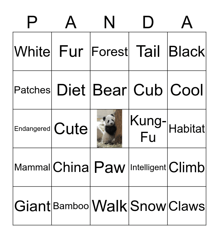 This bingo card has a free space and 24 words: China, Bamboo, Bear, Giant, Black, White, Patches, Fur, Kung-Fu, Paw, Cub, Endangered, Intelligent, Climb, Diet, Snow, Habitat, Forest, Cool, Cute, Claws, Mammal, Tail and Walk.